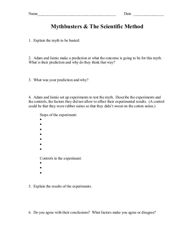 Mythbusters experiments are use to help learn independent and dependent variables. Please subscribe to 24/7 science! The answer is no, as . The mythbusters use the scientific method in clever and creative ways to prove or disprove. Worksheet for any mythbusters episode.